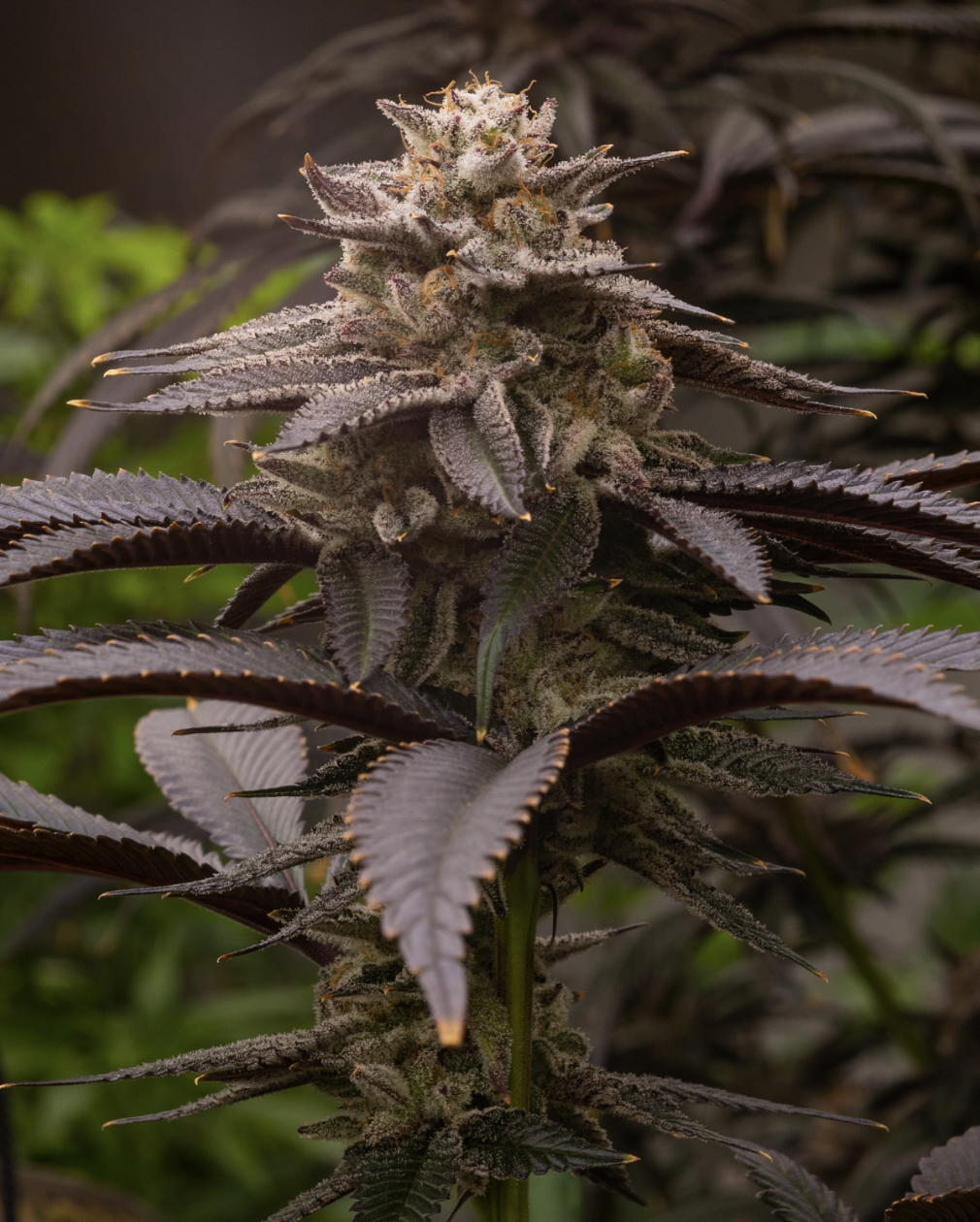 Head Candy exhibits dense stelliform flowers and moderate internodal spacing. Most phenos have very purple leaves with some purpling in the bud, along with very high trichome accumulation, giving sugar leaves a velvet appearance.
